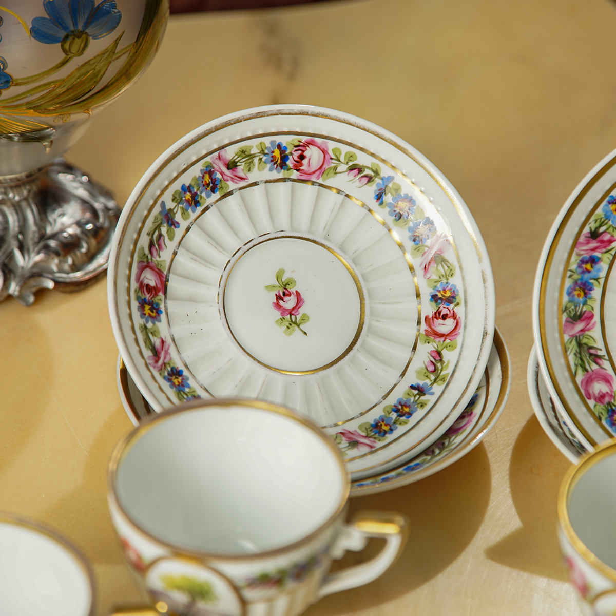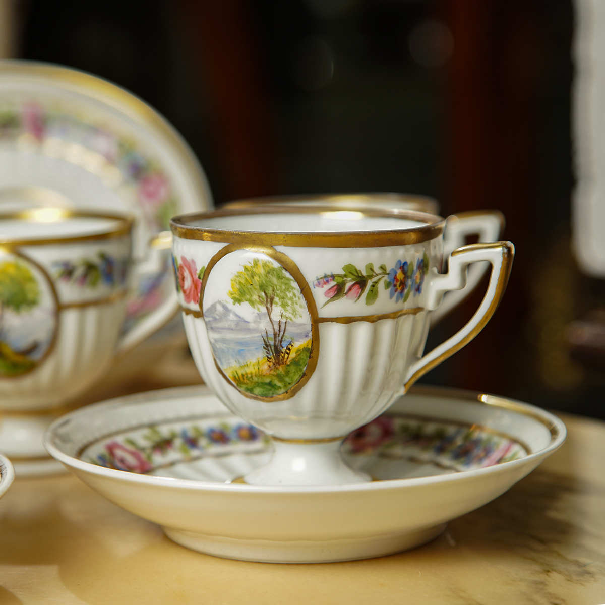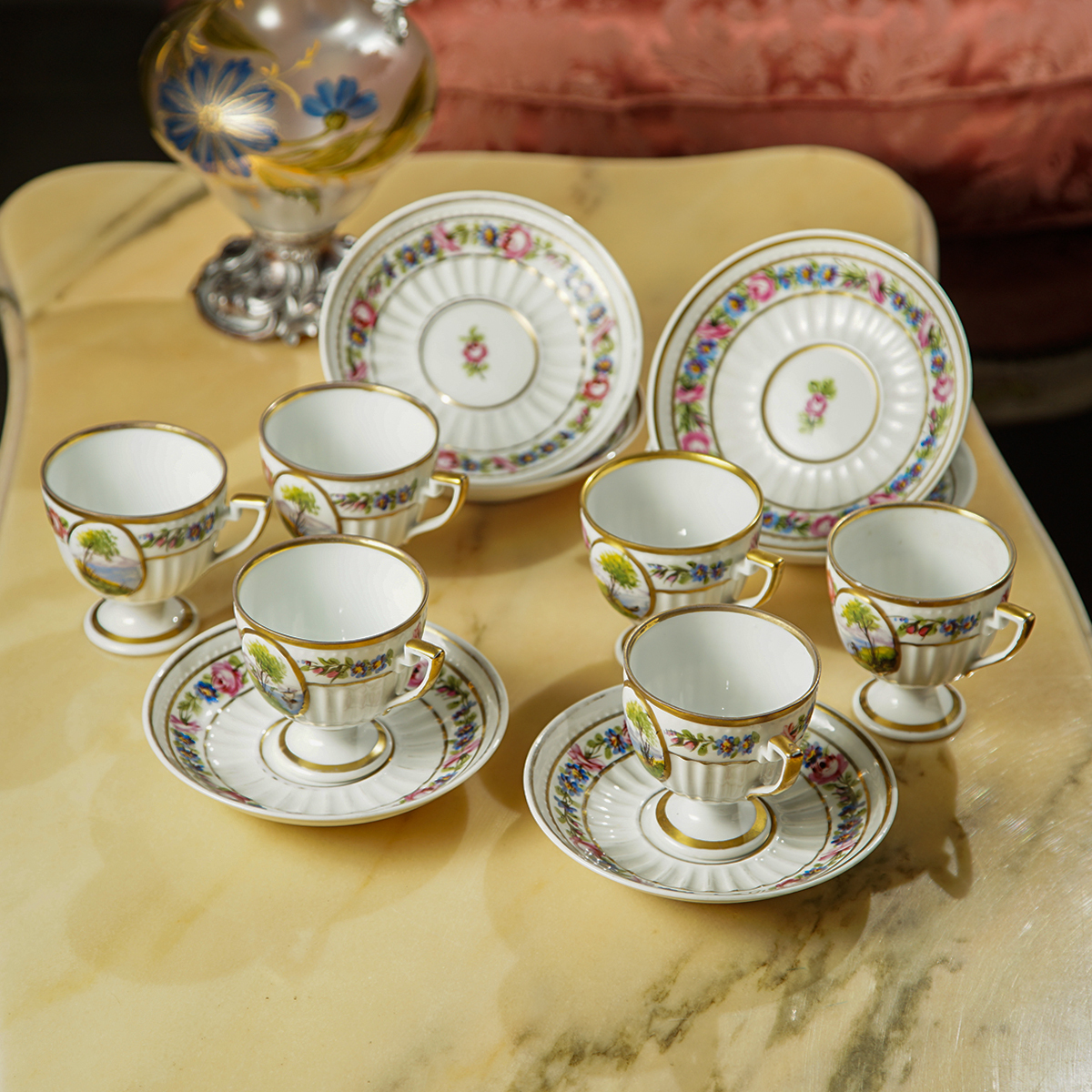 This rare set is made of porcelain by the method of casting into a mold, which gives it special strength and elegance. The central element of the design of the cups is their elegant legs and handles, made in a wonderful geometry. The saucers are also distinguished by a fluted surface, which gives them additional charm. Overglaze painting decorates each element of the set. Delicately drawn floral garlands and idyllic landscapes placed in oval reserves give this service a unique charm and sophistication.